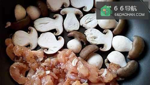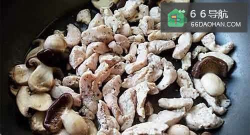 3少许油热锅,先再一侧铺入松本茸片,再在另一侧空间倒入鸡肉片。