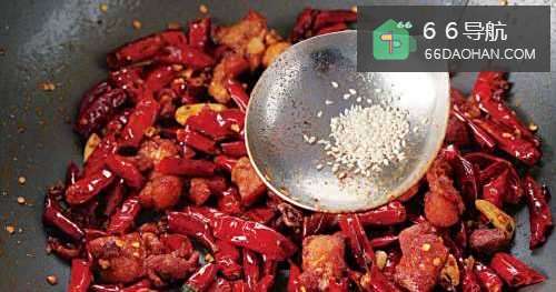 下入干辣椒段,待辣椒段变色后,适当淋入几滴香油或红油,下入鸡块煸炒
