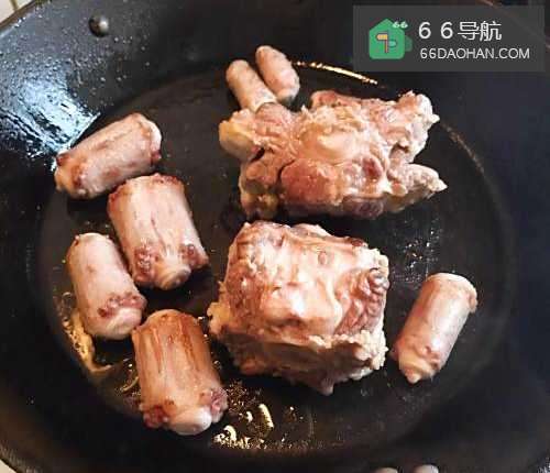 2接着将牛尾用凉水浸泡3小时,擦干下放底油的锅煎至金黄色即可。