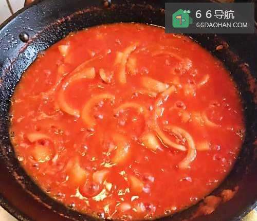 4紧接着加入番茄糊,熬至半干后放入一小块黄油和一勺面粉炒香。