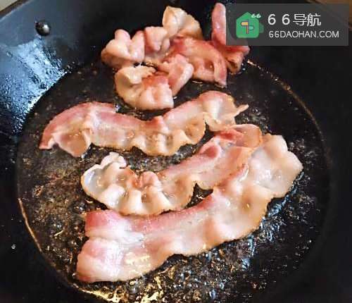 3接下来将培根直接下锅煎至微焦后直接用锅中油直接炒洋葱,洋葱头碎和蒜末,炒制香味出来即可。
