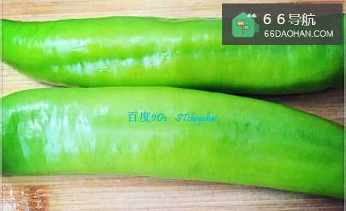 4准备2个黄皮椒,将其清洗一下,然后切去头尾,沿着斜线将黄皮椒切成小段状。