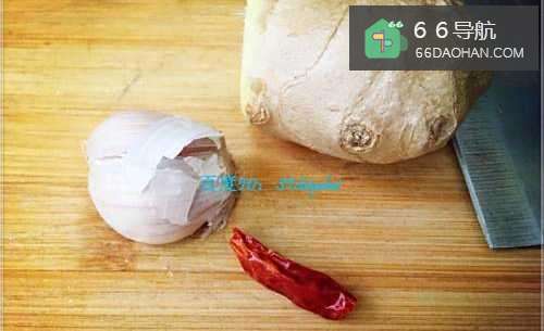6准备少许蒜头、生姜、辣椒干,分别处理一下,将其加工成蒜末、姜丝、辣椒段,将刚才焯牛蛙的水倒掉,将锅清洗干净,然后沥干水渍,加入适量油,放入骨料爆香。
