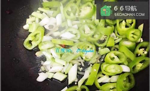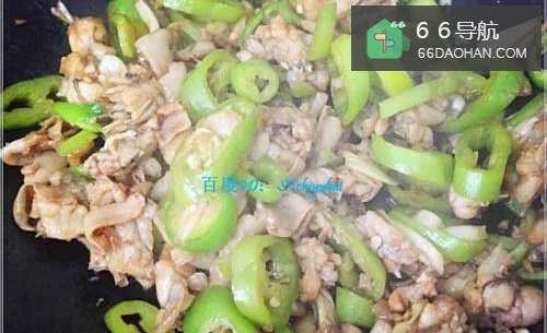 7先倒入黄皮椒和葱头,混合炒一会,待黄皮椒开始变软之后,再倒入前面腌制的牛蛙肉。