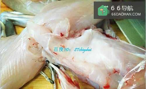 准备1~2只牛蛙,让卖牛蛙的师傅帮忙处理一下,皮不要;将牛蛙带回来清洗一下,然后切成小块状。