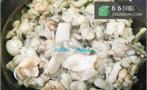 2打开电磁炉,往锅内加入适量的水,加入少许盐巴和醋将水烧开,倒入前面切好的牛蛙肉,过水焯一阵,5~7分钟左右。