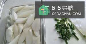 13炖的过程中,来处理山药,洗净去皮,切滚刀块,用水漂着,以防变色;葱切小段,准备一小块冰糖;