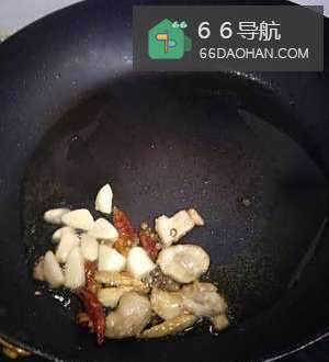4就可以放入蒜、干辣椒、花椒一起煸一下;