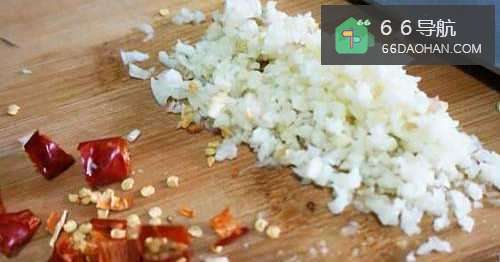 6将蒜末,姜末,干辣椒段摆在黄瓜上。