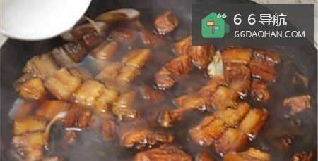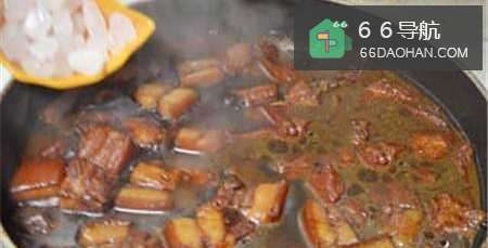 14加盖中小火炖制约40分钟,用筷子能轻松戳透肉皮,倒入冰糖,轻轻翻动肉块。