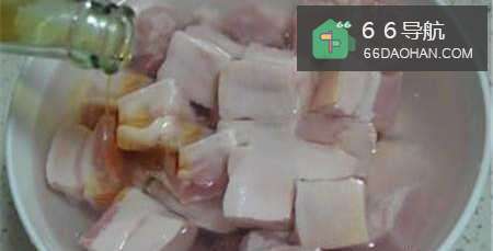 2肉洗净,切成2.5厘米见方的块,用清水加料酒浸泡15分钟。