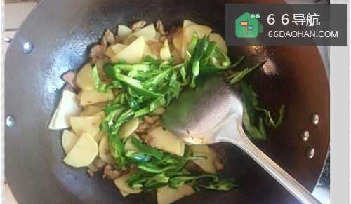 7待土豆片六七分熟的时候就可以加入切好的青椒丝了,翻炒入味熟了即可出锅了。