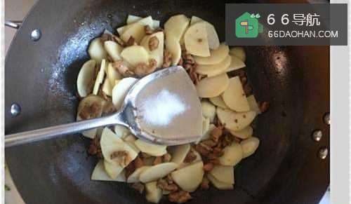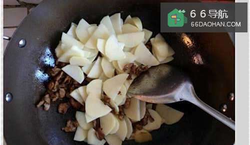 5然后倒入备用的土豆片,可以小火先慢慢的翻炒,等待土豆片上色。