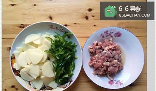 2肉和土豆都切成片、青椒切丝切片都是可以的,因为没有生姜了,所以后面我会在烧的时候多加一点料酒调味。