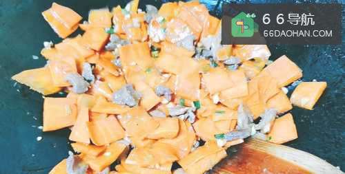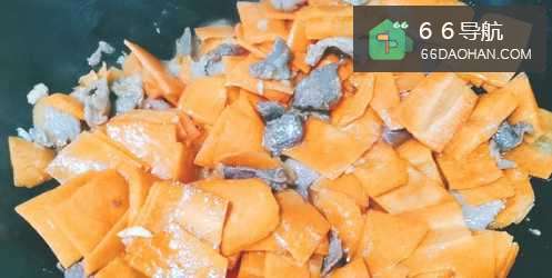 6接着把胡萝卜片放入锅中再翻炒一分钟。