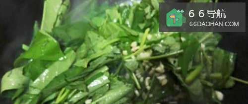 3再加入菜叶,蒜泥、盐同炒,为避免盐化不开,淋少许水,翻炒两下即可。