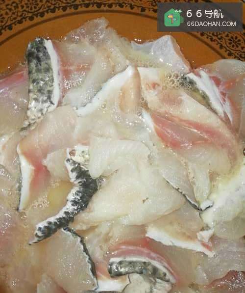 去一点淀粉、加一个鸡蛋清(蛋黄我放鱼骨头汤里了),一点料酒、醋,将生鱼片腌制。