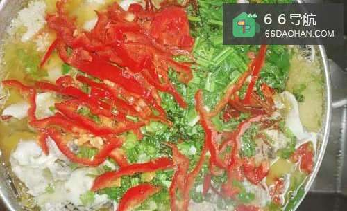 9鱼片变色后即关火,放入干椒丝、香菜、葱花等佐料。