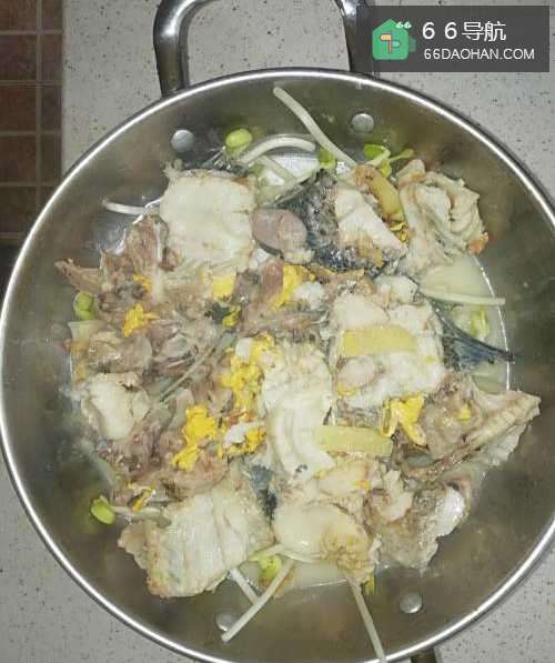 7鱼骨头经过一个小时,已经煮成乳白色,连汤带骨头倒入放有酸菜的大盆中。