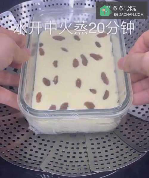 5在表面放上葡萄干,再盖上保鲜膜,然后用牙签在保鲜膜上扎孔