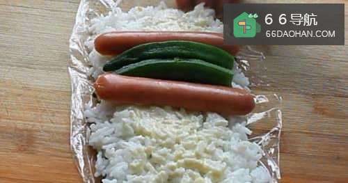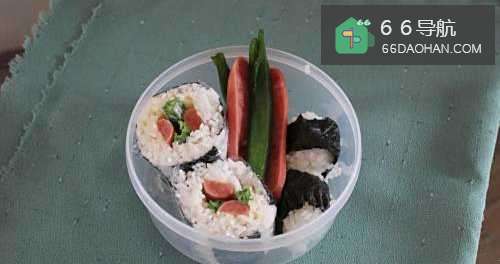 8将卷有秋葵和香肠的切开,最后把所有饭团和剩下的食材放到饭盒里就可以了。