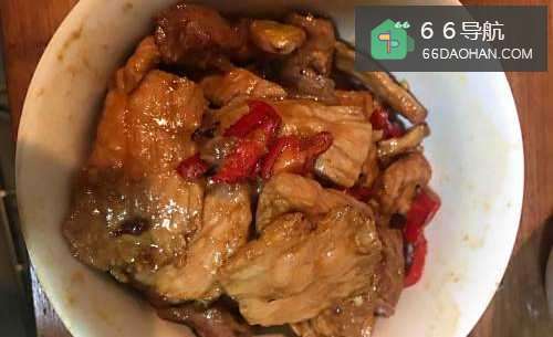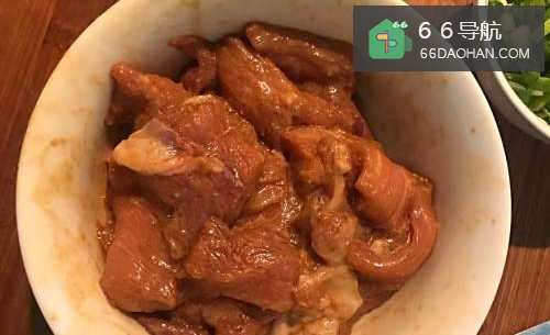 6打开油锅加热后,倒入少量的油,加入辣椒配料爆出味道,加入瘦肉进行翻炒,炒至黄金色捞出备用。