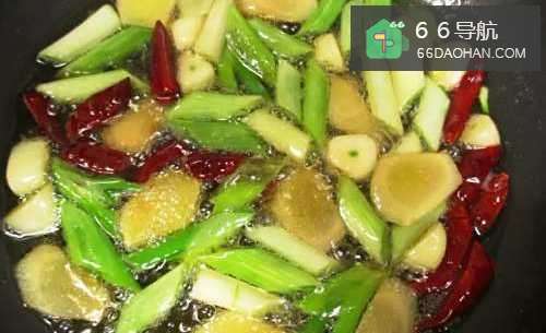 2混合半大匙油和半大匙麻油,小火慢慢煸香干辣椒、葱白、姜、蒜。