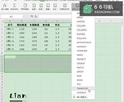 3在“查找与引用”函数列表中,选择函数【TRANSPOSE】;