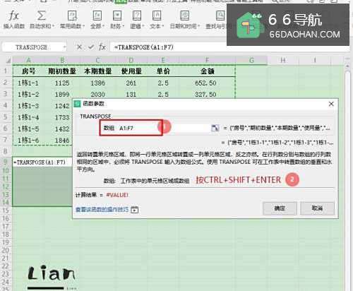 4在“函数参数”对话框中,输入数组【A1F7】,然后按键盘快捷键【CTRL+SHIFT+ENTER】即可;