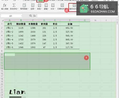 2选择数据表格区域【A9G14】,点击【公式】—【查找与引用】;