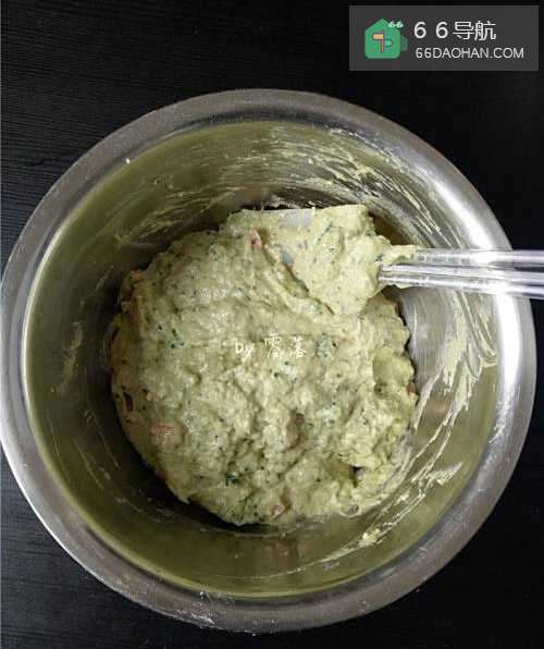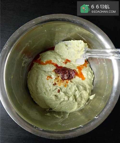 7用刮刀翻拌均匀,无干粉即可停止翻拌,以免面粉起筋;调入适量沙茶酱;