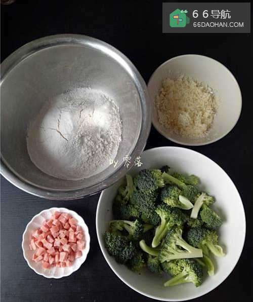 备好食材低筋面粉、无铝泡打粉混合过细筛;西兰花掰成小朵洗净,火腿切丁,马苏里拉芝士刨丝备用。