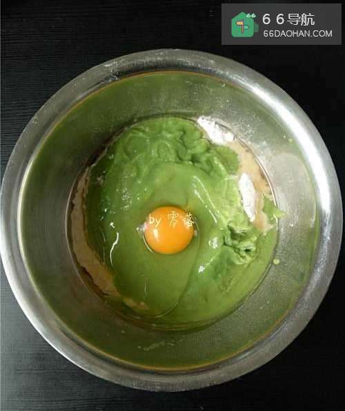 6将西兰花泥倒入面粉盆里,磕入1个鸡蛋,倒入20g玉米油;