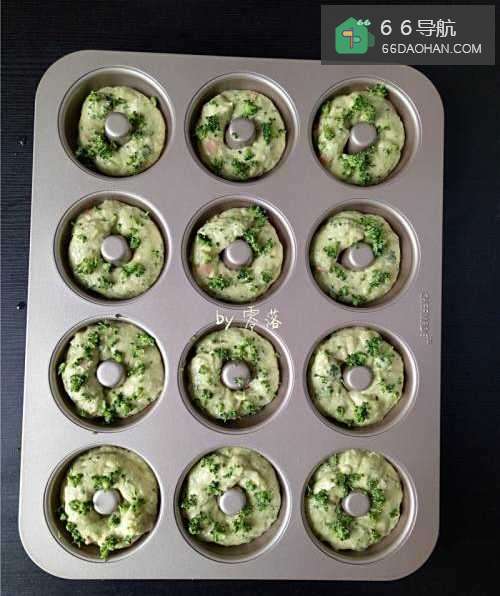 10将面糊倒入模具,撒上西兰花顶部绿色部分;