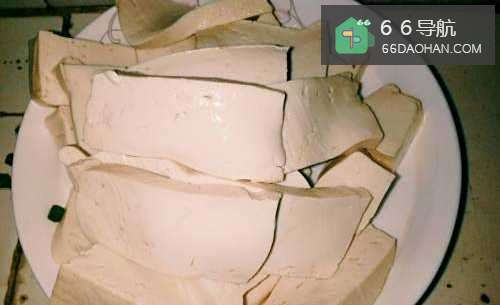 5第五步将豆腐洗净,切成宽约3厘米厚的片状,装入碗中,备用。