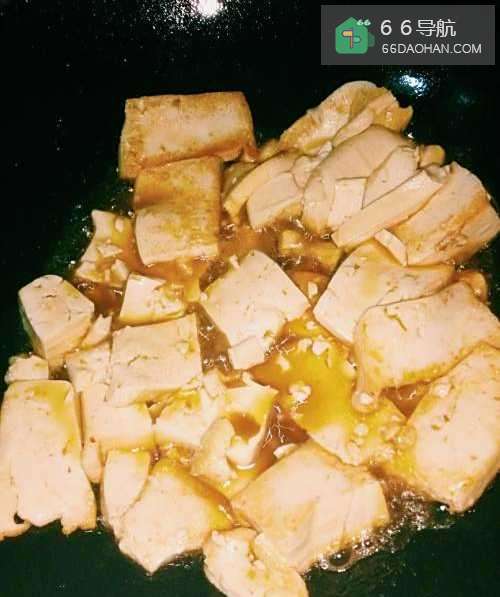 6第六步取炒锅,开火,放油,待油锅冒烟的时候,将火调至小火,放入切好的豆腐片,用铲子轻轻翻炒,待两面出现脆皮黄色的时候,关火,将豆腐盛出。