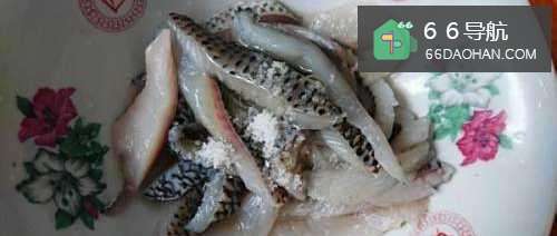 将花雕鱼清理干净,取身体两侧的肉片成片状,然后再切成条,依次放入食盐,白胡椒粉,料酒和蛋清搅拌均匀腌制15分钟。
