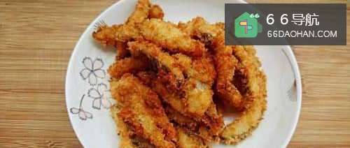 3将腌好的鱼肉先沾上蛋液,然后再在面包糠里滚一滚。