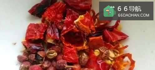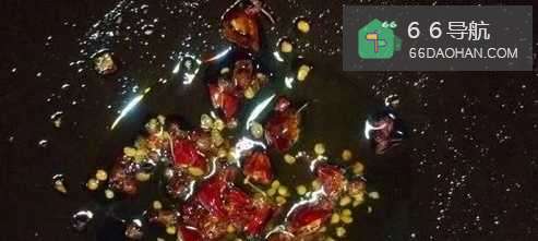 4锅中倒入适量的油,加入花椒粒和干红辣椒段煸出香味。