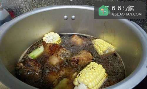6倒入高压锅中,加玉米、食盐、料酒、酱油、食醋各适量,调拌均匀。