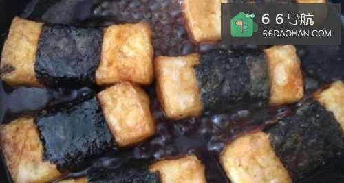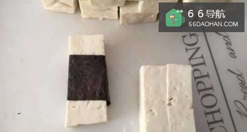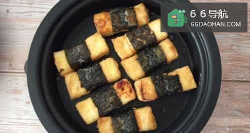 1、首先,我们将北豆腐切成长方形小条,如图;2、然后用海苔卷把豆腐缠绕一圈,如图;3、接下来,把豆腐裹上薄薄的一层淀粉;4、在碗中加入适量的生抽、蚝油、蜂蜜、清水,然后调匀;5、起锅烧油,放入豆腐,等到豆腐可以来回滑动的时候翻面,煎至四面金黄;6、最后,我们倒入碗汁,中小火至汤汁变得浓稠,就可以出锅了。