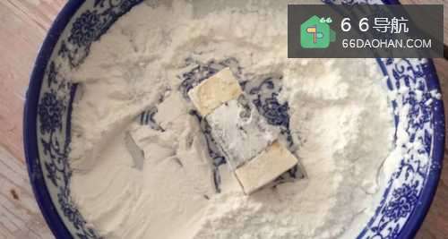 3接下来,把豆腐裹上薄薄的一层淀粉;