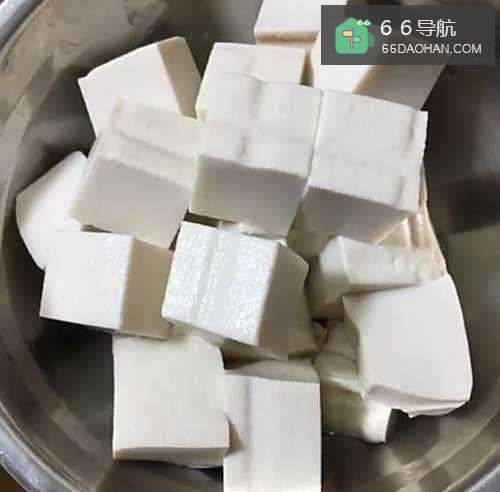 3豆腐洗净切成大块,再把豆腐放到调好的鸡蛋液里。