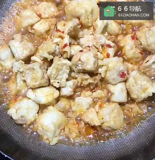 6把炸好的豆腐倒入锅中,大火收汁,起锅撒上葱花即可。