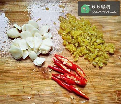 4将红尖椒斜切、泡椒剁碎一点、大蒜切片,备用。
