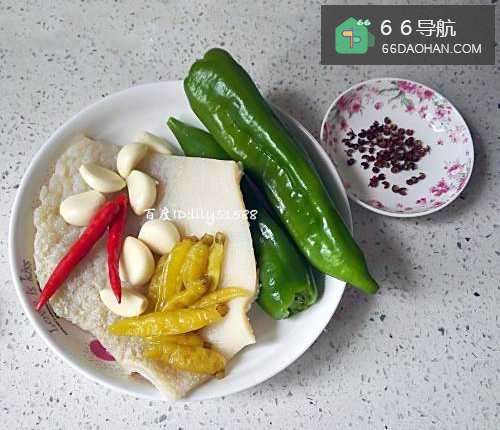 准备好食材牛肚、青椒、大蒜、泡椒、花椒、红尖椒,洗干净备用。