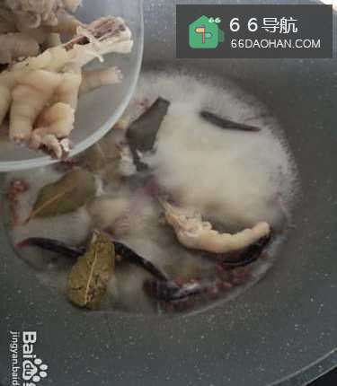 2锅里放多水,同冷水一起放入切开的鸡爪,煮到水沸,看到很多血沫的时候,加入一小匙料酒。