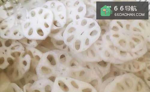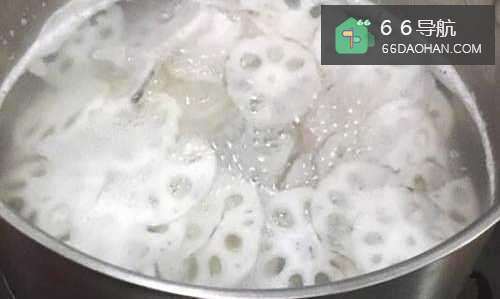 5水烧开后,倒入藕片,喜欢脆的煮2、3分钟即可以捞出来。