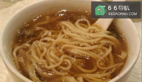 面条为人工拉制(抻面,当地俗称“摔面”),条细而韧,卤为真绸(俗称加吉鱼)熬汤兑制,加适量绿豆淀粉,配以酱油、木耳、香油、八角、花椒等佐料,每碗一两,具有独特的海鲜风味