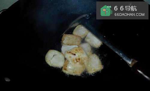 4把锅子烧热,倒入一些油,中火把豆腐煎得稍微有点金黄。